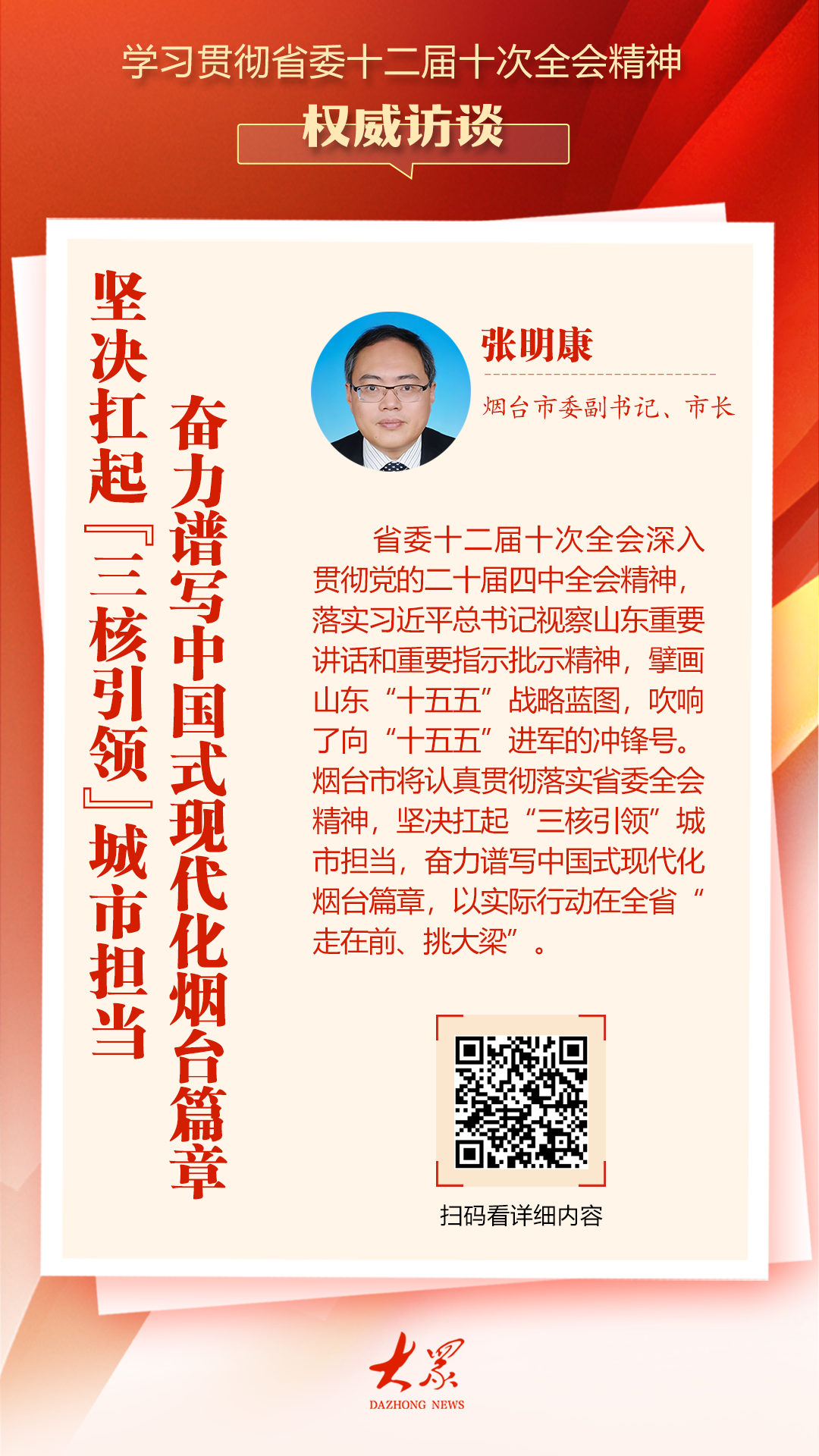 省委十二屆十次全會深入貫徹黨的二十屆四中全會精神,落實習近平總書記視察山東重要講話和重要指示批示精神,擘畫山東“十五五”戰略藍圖,吹響了向“十五五”進軍的沖鋒號。煙臺市將認真貫徹落實省委全會精神,堅決扛起“三核引領”城市擔當,奮力譜寫中國式現代化煙臺篇章,以實際行動在全省“走在前、挑大梁”。